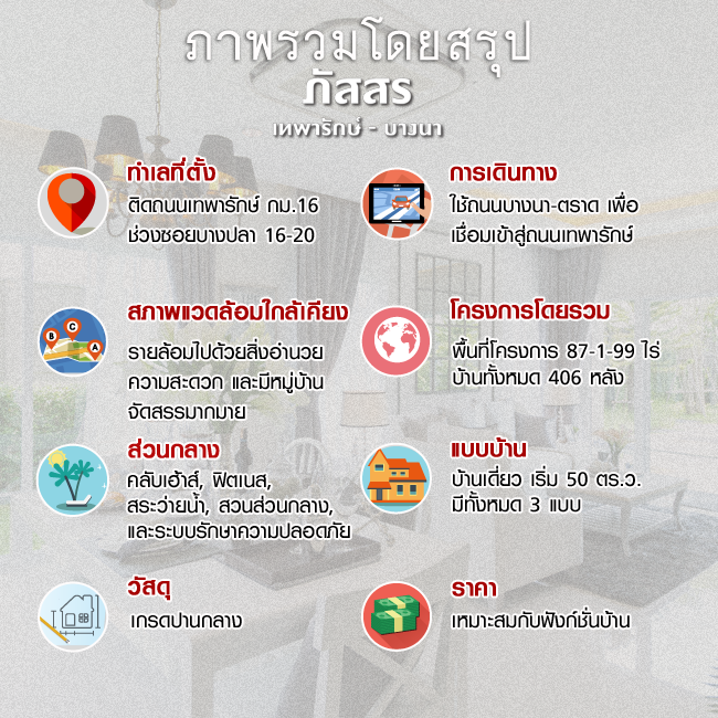 โครงการภัสสร เทพารักษ์ - บางนา (Passorn Thepharak - Bangna) เป็นโครงการบ้านเดี่ยว 2 ชั้น ตั้งอยู่บนถนนเทพารักษ์ กม.16 ตำบลบางพลีใหญ่ อำเภอบางพลี จังหวัดสมุทรปราการ 10540 เดินทางเข้า-ออกโครงการด้วยเส้นทางหลักถนนเทพารักษ์ มีบ้านทั้งหมด 406 หลัง บนพื้นที่โครงการ 87-1-99 ไร่ ถนนตรงซุ้มประตูทางเข้ากว้าง 20 เมตร ถนนหลักกว้าง 16 เมตรตามลำดับ ถนนภายในซอยกว้าง 8 เมตร พร้อมฟุตบาททั้งสองฝั่ง มีรั้วรอบโครงการสูงถึง 3 เมตร และรั้วเหล็กแหลม 50 เซนติเมตร ภายในโครงการมีสิ่งอำนวยความสะดวกครบครัน ทั้ง Club house สระว่ายน้ำ ฟิตเนส และสวนส่วนกลาง 2 จุดขนาด 1 ไร่ (สิ่งอำนวยความสะดวกทั้งหมดนี้กำลังอยู่ระหว่างการก่อสร้าง) ถนนทางเข้าโครงการตั้งแต่ปากซอยถนนเทพารักษ์ เป็นถนนสาธารณะประโยชน์ใช้ร่วมกับผู้อื่น ส่วนถนนตั้งแต่สะพานข้ามคลองเป็นถนนภาระจำยอมกว้าง 18 เมตรค่ะ