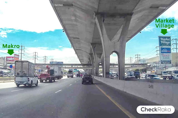 จนมาถึงกับ Makro หรือ Market Village ตรงนี้ให้เริ่มเบี่ยงซ้าย ออกบางนา-ตราด กม.10 ได้เลยค่ะ