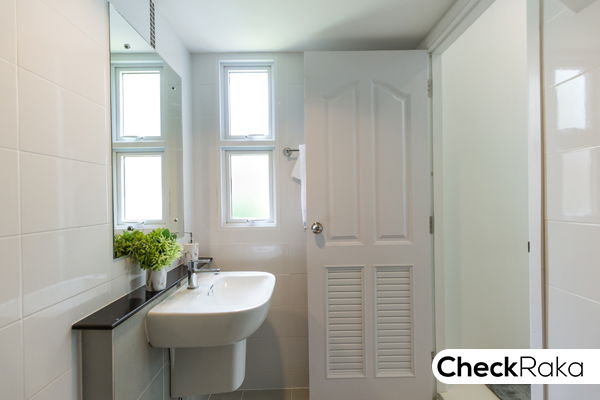 ข้างๆ อ่างล้างมือมีหน้าต่างบานกระทุ้ง 2 บาน สำหรับเปิดระบายอากาศและความชื้น
