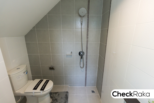 อีกฝั่งหนึงวางโถสุขภัณฑ์ และติดตั้งฝักบัวอาบน้ำ