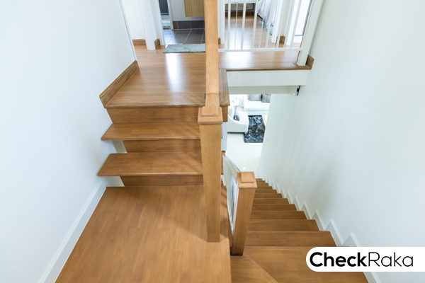 บันไดทางขึ้นของที่นี่เป็นโครงสร้างเหล็ก พื้นบันไดและมือจับไม้สำเร็จรูป