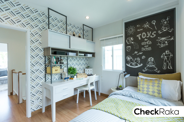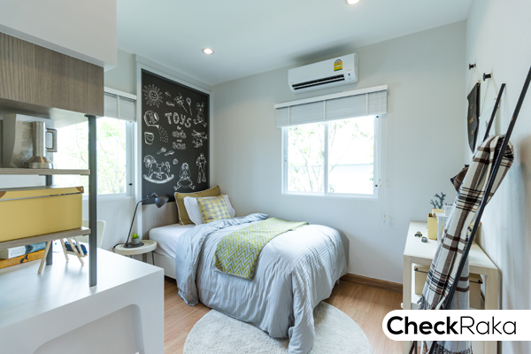 เป็นห้องนอนคุณลูกๆ วางเตียงขนาด 3.5 ฟุต มีพื้นที่ปลายเตียงหลือเล็กน้อยจะวางตู้เสื้อผ้าแบบบ้านเลื่อนก็ได้