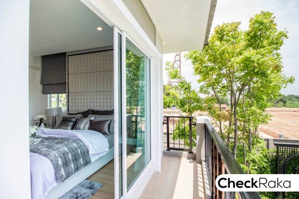 ประตูบานเลื่อนขนาดใหญ่เปิดออกไปที่ระเบียงได้