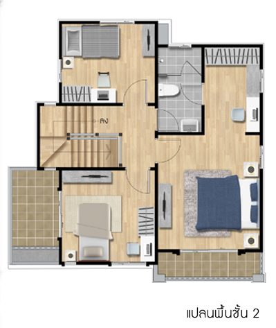 เมื่อขึ้นมาที่ชั้น 2 แล้ว จะพบกับฟังก์ชั่นบ้านของห้องต่างๆ ดังรูปนี้ค่ะ เริ่มจากฝั่งซ้ายมือ คือห้องนอน 3 ติดกันคือห้องน้ำ