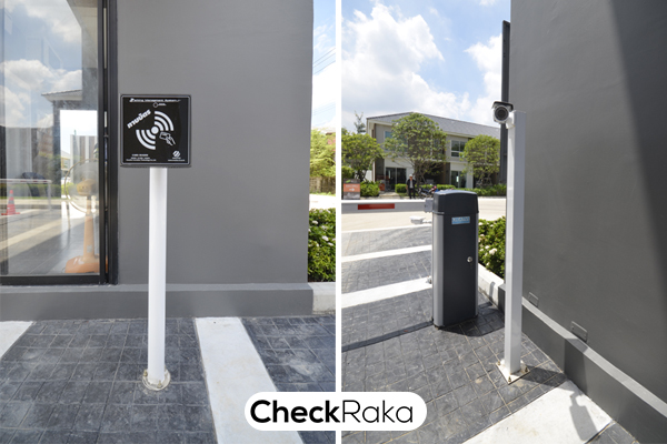 ที่ซุ้มประตูทางเข้ามีทั้ง รปภ. อำนวยความสะดวก การ์ดสแกน, ไม้กั้นกระดก, และ CCTV (ที่ประตูทางเข้ามีกล้อง 2