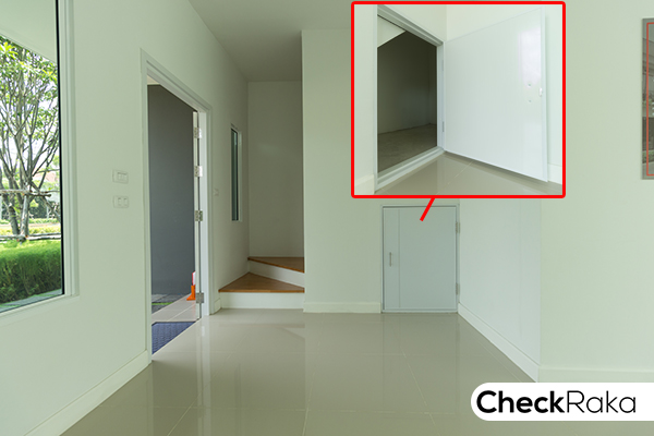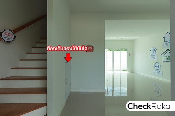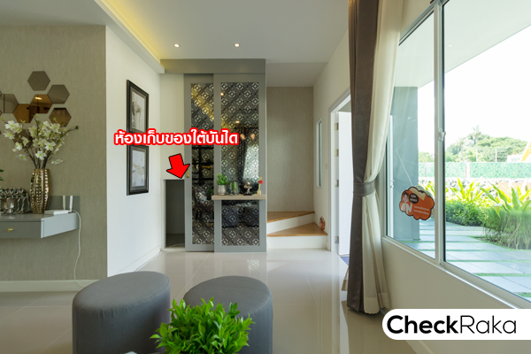 บ้านของที่นี่จะมีห้องเก็บของใต้บันไดอยู่ข้างๆ บันไดทางขึ้นชั้น 2 นะคะ บ้านตัวอย่างจะ Built in ประตูบานเลื่อนปิดไว้
