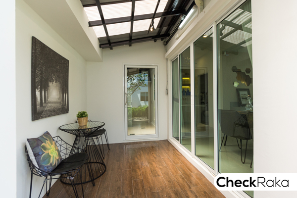 วางเก้าอี้นั่งพักผ่อน ซึ่งสามารถปรับพื้นที่ส่วนนี้ตามใจชอบได้เลย เพราะทางโครงการลงเสาเข็มไว้รองรับการต่อเติมแล้วค่ะ
