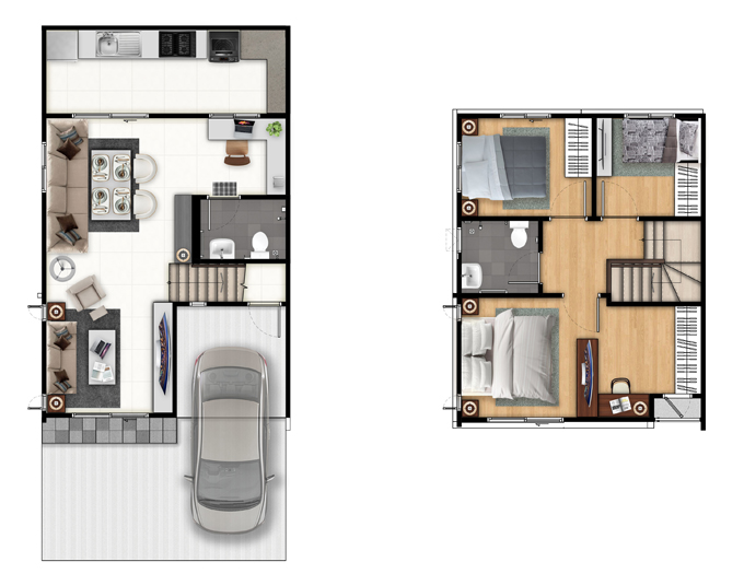 แปลนบ้านทั้งสองชั้นของแบบ 2 ที่จอดรถ