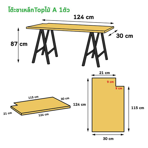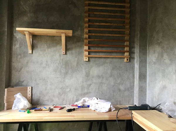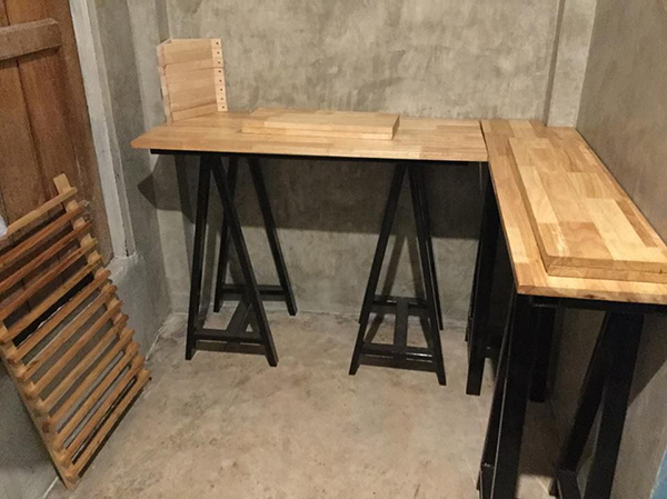 ขั้นตอนที่ 8 ต่อมาก็สั่งทำโต๊ะเป็นงานไม้ผสมเหล็ก แล้วก็ท็อปสำหรับติดผนังและที่ยึดซื้อที่ IKEA