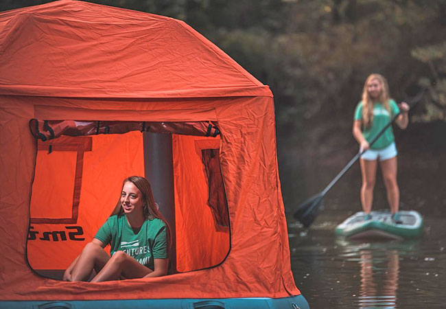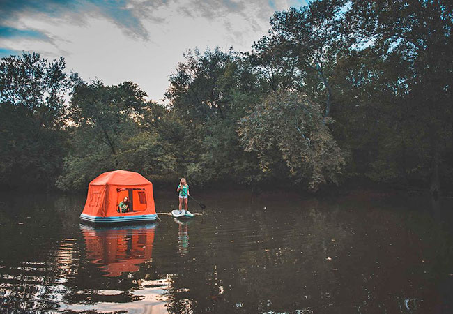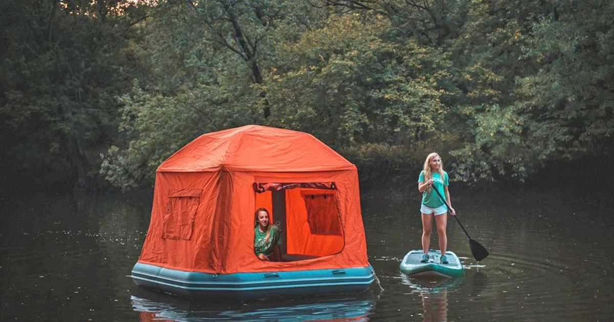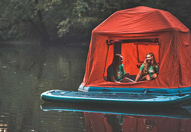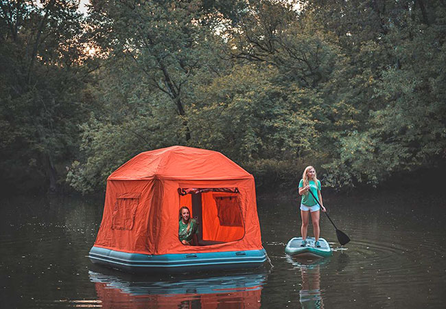 เจ้าเต็นท์ลอยน้ำหลังแรกของโลกนี้ เป็นงานออกแบบของ SmithFly บริษัทขายอุปกรณ์กลางแจ้ง ที่โอไฮโอ ของสหรัฐฯ ตัวเต็นท์หนาถึง 6 นิ้ว กันน้ำได้สบายหายห่วง เป็นเต็นท์แบบพองลมนะคะ ไม่มีบรรดาโครงเหล็กระโยงระยาง ตรงกลางเป็นโดมสูง ถ้าคุณไม่ตัวสู๊งสูงจนเกินไป... ก็น่าจะยืนได้สบาย