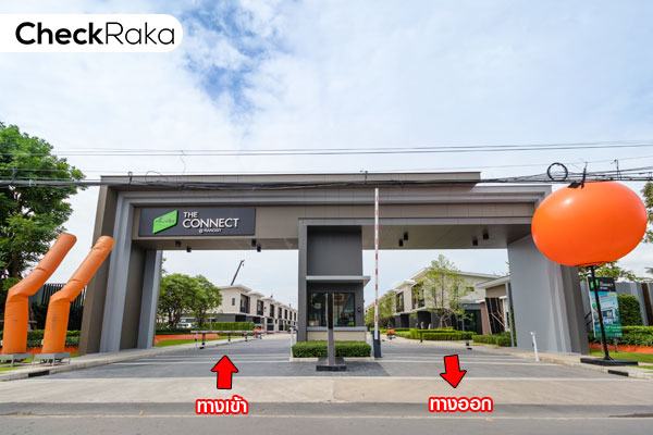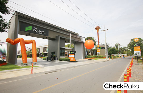 ด้านหน้าโครงการฝั่งซ้ายมือมีป้ายชื่อ THE CONNECT @ RANGSIT มองเห็นได้ชัดเจน