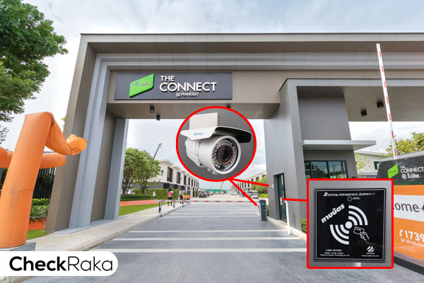 ทางเข้าฝั่งซ้ายมือมีทางเดินเข้าโครงการสำหรับคนเดินเข้าให้ มี การ์ดสแกน, ไม้กั้นกระดก, และ CCTV