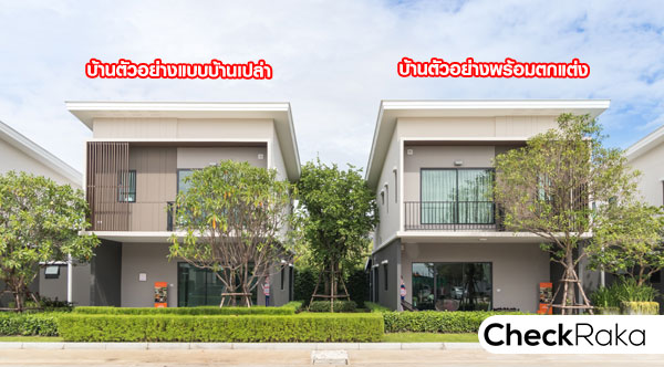 บ้านตัวอย่างพร้อมตกแต่งในแบบเดียวกัน จะเห็นว่ามีการจัดวางผังห้องอยู่คนละฝั่งกัน แต่มีฟังก์ชั่นการใช้งาน