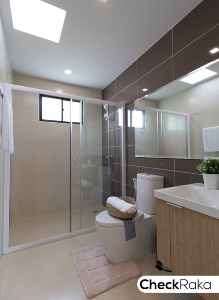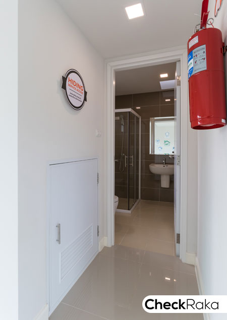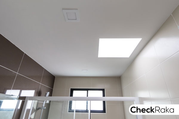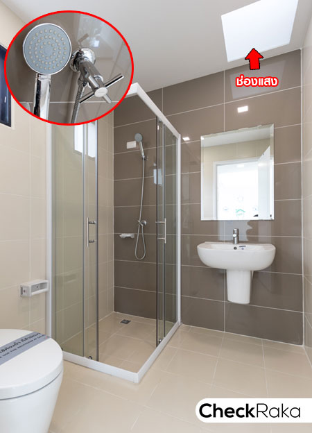 ตู้เบรกเกอร์ และกริ่งบนกำแพงหน้าห้องน้ำ จะติดตั้งตรงจุดนี้ ส่วนฝ้าเพดานที่เห็นจะมี Sky Light เพิ่มความสว่างให้พื้นที่