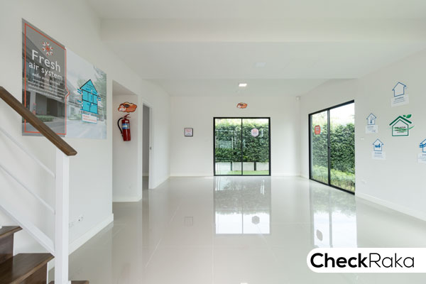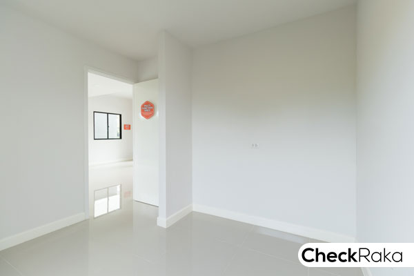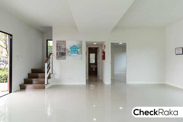 บ้านที่เห็นนี้เป็นบ้านเปล่ามาตรฐานที่ใช้ส่งมอบลูกค้า วัสดุต่างๆ ก็ให้ตามที่เห็นเลยค่ะ ด้านหน้าบ้านเป็นประตูบานพับ