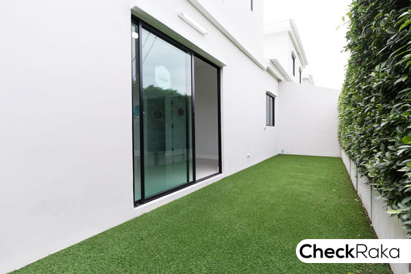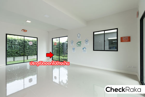 ประตูบานเลื่อนขนาดใหญ่เปิดออกไปลานซักล้างหลังบ้าน สำหรับบ้านตัวอย่างหลังนี้ ทางโครงการจะปูกระเบื้องที่พื้น