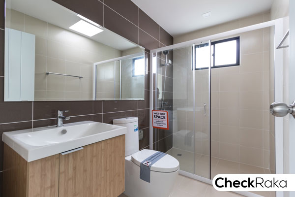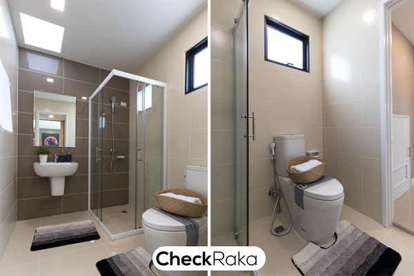 ห้องน้ำชั้น 2 มีสุขภัณฑ์ให้ครบ และแยกพื้นที่ส่วนเปียก/แห้งด้วยฉากกั้นบานเลื่อน