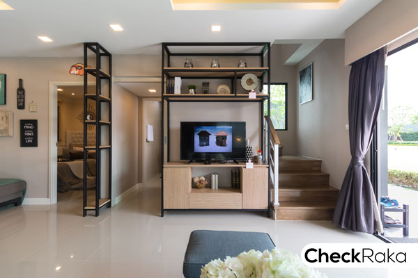 ฝั่งตรงข้ามโซฟารับแขก เป็นพื้นที่สำหรับจัดวางทีวี หรือตกแต่งเป็นชั้นวางของก็ได้นะคะ