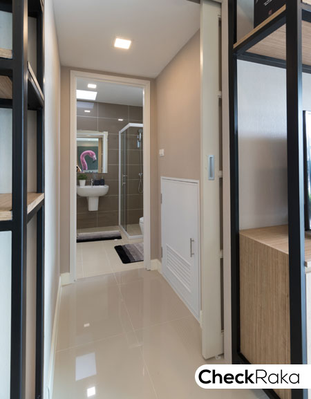 ทางเข้าห้องน้ำ ที่ทางโครงการนำประตูบานเลื่อนมาติดตั้งไว้ เมื่อปิดประตูแล้วจะมองไม่เห็นห้องน้ำ