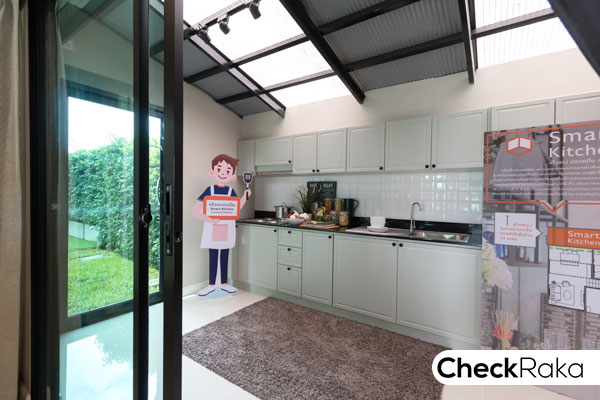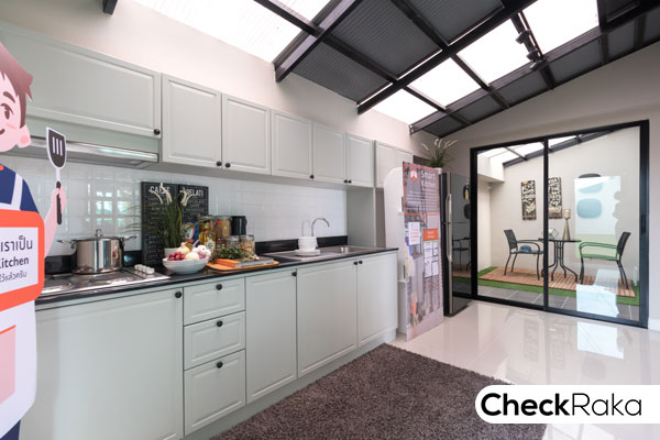 และมุงหลังคาจัดเป็นห้องครัว วางเคาน์เตอร์ขนาดใหญ่ ซึ่งเจ้าของบ้านสามารถปรับพื้นที่ส่วนนี้ตามใจชอบได้เลย