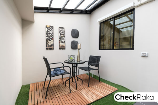 จัดเป็นพื้นที่นั่งเล่นหลังบ้าน วางเก้าอี้นั่งพักผ่อน