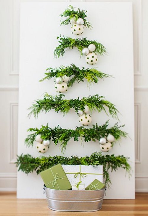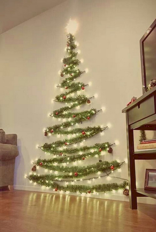 นำเถาต้นฮอลลี่มาจัดแต่งตรงผนังบ้าน ให้เป็นรูปทรงต้นคริสต์มาส แล้วประดับประดาด้วยดวงไฟและลูกบอล