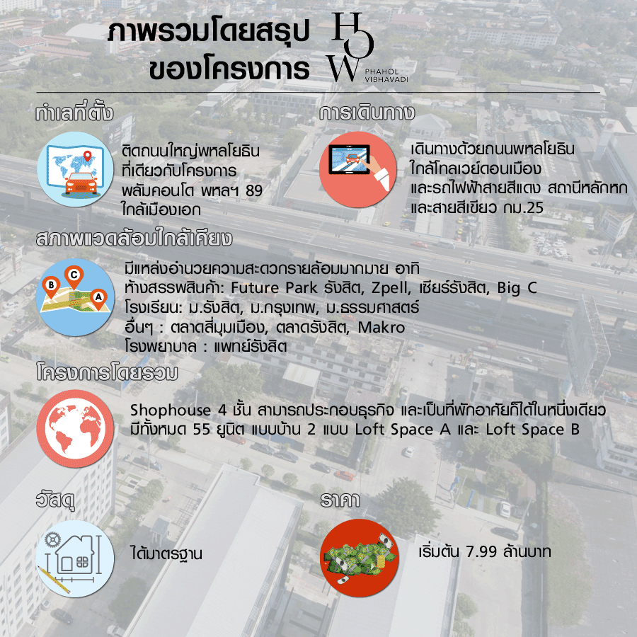 เข้ามาดูสภาพแวดล้อมใกล้เคียงของโครงการที่ถือว่าเป็นไฮไลท์สำคัญทีเดียว สำหรับตัวโครงการออกแบบให้เป็น Modern Luxury Shop House ที่สามารถอยู่อาศัย และเปิดร้านค้าได้ หรือทำธุรกิจใดๆ ทำเลที่ตั้งก็ถือว่าเป็นเรื่องที่ต้องให้ความสำคัญ สำหรับโครงการ ฮาว พหลฯ - วิภาวดี ตั้งอยู่ติดกับถนนพหลโยธิน ช่วงซอยพหลโยธิน 89 โดยโซนนี้ถือว่าค่อนข้างคึกคัก เพราะเป็นย่านที่มีผู้คนอาศัยอยู่เยอะ ทั้งกลุ่มคนในพื้นที่ และกลุ่มนักศึกษามหาวิทยาลัยรังสิต ทำให้มีแหล่งอำนวยความสะดวกรายล้อมอยู่อย่างครบครัน เราไปดูบรรยากาศสภาพแวดล้อมโดยรอบโครงการ ว่ามีอะไรบ้าง