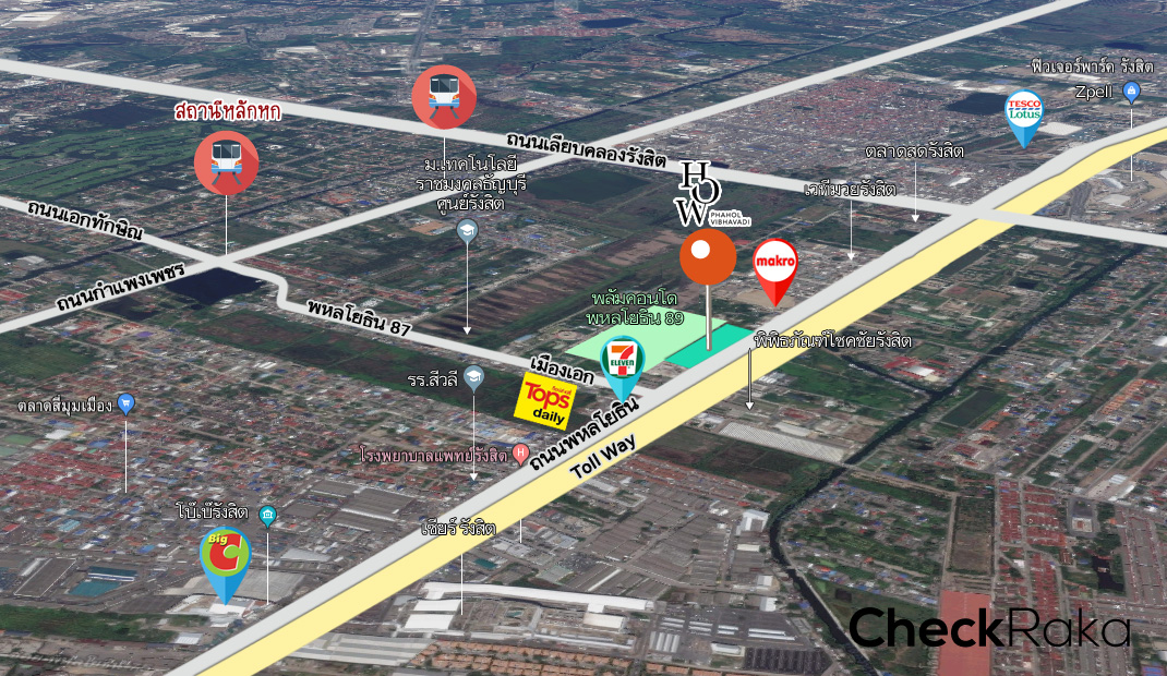 เข้ามาดูสภาพแวดล้อมใกล้เคียงของโครงการที่ถือว่าเป็นไฮไลท์สำคัญทีเดียว สำหรับตัวโครงการออกแบบให้เป็น Modern Luxury Shop House ที่สามารถอยู่อาศัย และเปิดร้านค้าได้ หรือทำธุรกิจใดๆ ทำเลที่ตั้งก็ถือว่าเป็นเรื่องที่ต้องให้ความสำคัญ สำหรับโครงการ ฮาว พหลฯ - วิภาวดี ตั้งอยู่ติดกับถนนพหลโยธิน ช่วงซอยพหลโยธิน 89 โดยโซนนี้ถือว่าค่อนข้างคึกคัก เพราะเป็นย่านที่มีผู้คนอาศัยอยู่เยอะ ทั้งกลุ่มคนในพื้นที่ และกลุ่มนักศึกษามหาวิทยาลัยรังสิต ทำให้มีแหล่งอำนวยความสะดวกรายล้อมอยู่อย่างครบครัน เราไปดูบรรยากาศสภาพแวดล้อมโดยรอบโครงการ ว่ามีอะไรบ้าง