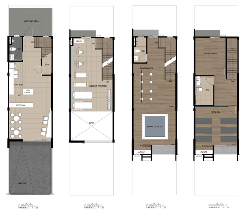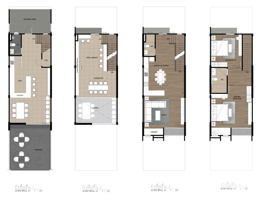 พื้นที่ใช้สอย 210 ตารางเมตร หน้ากว้าง 5 เมตร 2 ชั้นสำหรับพื้นที่ธุรกิจ 2 ชั้นสำหรับพื้นที่การใช้ชีวิต พร้อม 2 ห้องนอน 3 ห้องน้ำ 1 ห้องนั่งเล่น 1 Pantry และที่จอดรถ 1 คัน