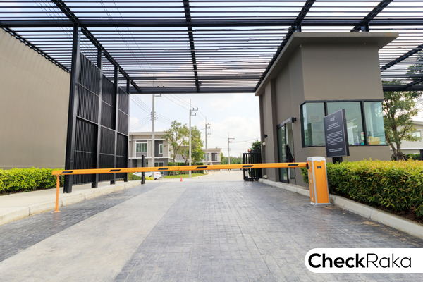 ที่ประตูทางเข้ามีทั้ง รปภ. อำนวยความสะดวก การ์ดสแกน, ไม้กั้นกระดก, และ CCTV (ที่ประตูทางเข้ามีกล้อง