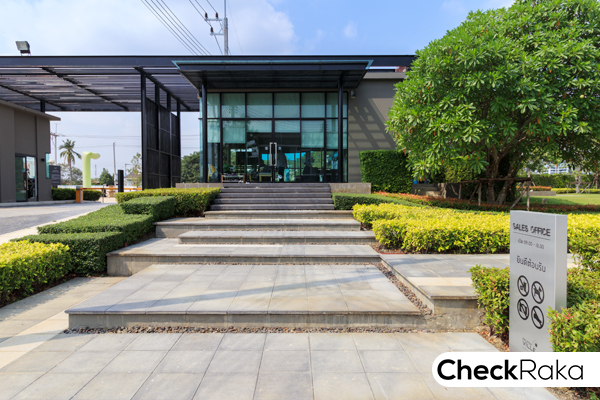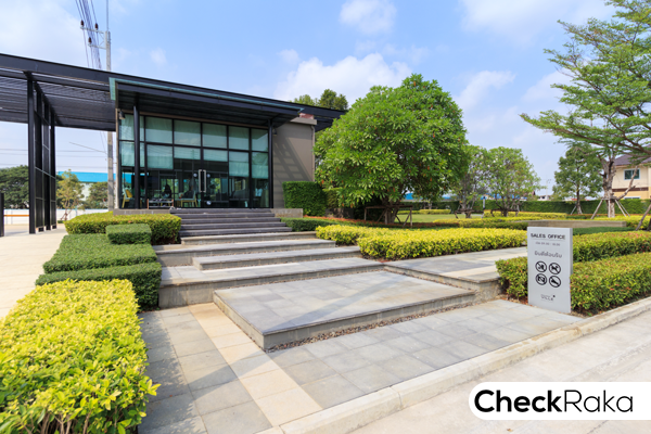 ผ่านประตูเข้ามาแล้วจะเห็น Sales Office อยู่ฝั่งซ้ายมือ บ้านตัวอย่างทั้งสองแบบก็อยู่ซอยแรกฝั่งซ้ายมือ