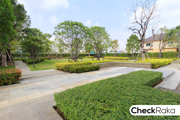 มีทางเดินสำหรับเดินเล่นในสวนไว้ให้ด้วย พร้อมลงไม้ใหญ่ ไม้พุ่มไว้ โดยรอบ