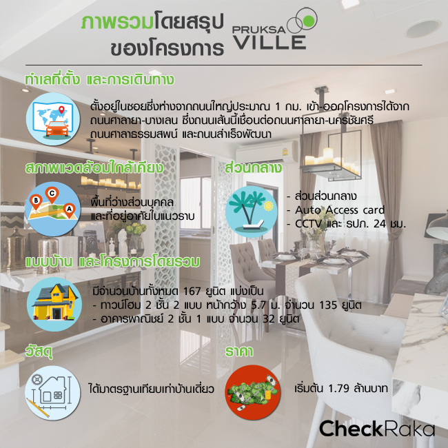 พบกันอีกแล้วนะคะ กับการรีวิว-เยี่ยมชมบ้าน วันนี้ CheckRaka.com ขอพาทุกท่าน ไปเยี่ยมชม โครงการในทำเลศาลายากันค่ะ ซึ่งโครงการนี้ เป็นทาวน์โฮมจากแบรนด์ พฤกษา มีชื่อว่า พฤกษาวิลล์ ศาลายา (ซ.5/8) (Pruksa Ville Salaya) ทาวน์โฮม 2 หน้ากว้าง 5.7 เมตร กับจุดเด่นเรื่องประโยชน์ใช้สอยภายในบ้าน เพิ่มความโปร่ง โล่ง ด้วยประตูบานใหญ่ และหน้าต่าง Enlarge-High window คัดสรรวัสดุชั้นดี เทียบเท่าบ้านเดี่ยว พร้อมทั้งพื้นที่ส่วนกลางที่มีพื้นที่สีเขียว ให้คุณได้ใกล้ชิดกับธรรมชาติ เปิดจองในราคาเริ่มต้นเพียง 1.79 ล้านบาท จะน่าสนใจแค่ไหน ตามมาชมรายละเอียดโครงการกันเลยค่ะ