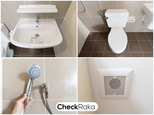 และมีฝักบัวอาบน้ำมาให้ และติดตั้งพัดลมระบายอากาศให้ด้วย