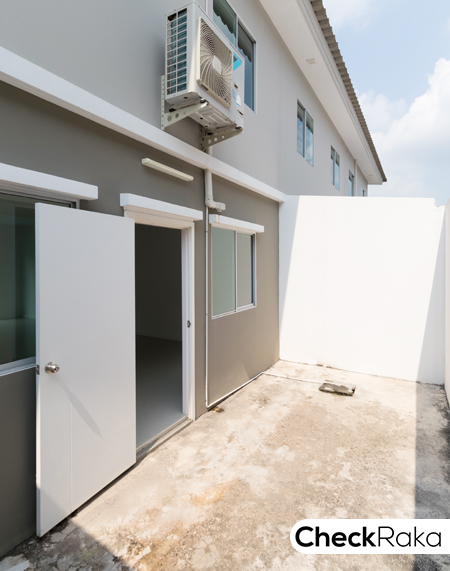 ไม่ได้จัดสวนปูหญ้า ด้านหน้ามีประตูเหล็กแบบโปร่งเป็นบานพับ มีรั้วระหว่างบ้าน สูงประมาณ 1.5 เมตร