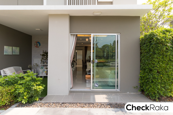 ประตูทางเข้าหลัก เป็นประตูบานเลื่อนเดี่ยวพร้อมมือจับ เฉลียงหน้าบ้านยกสูงจากพื้นลานจอดรถเล็กน้อย