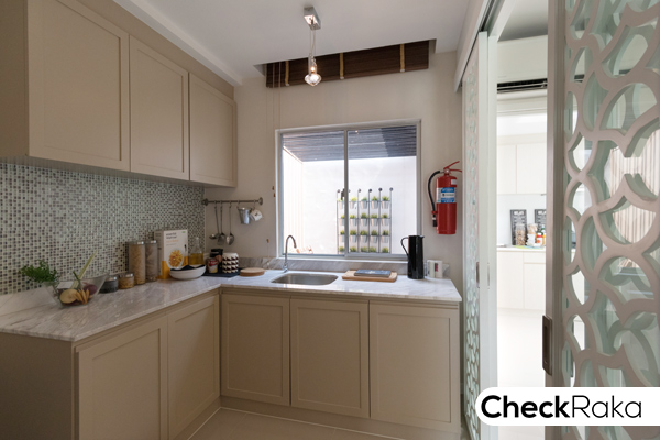 ตรงข้ามพื้นที่รับประทานอาหารจะเป็นห้องครัว ครัวของที่นี่เป็นครัวเปิด ไม่ได้ติดตั้งประตูมาให้ เหมาะสำหรับเตรียมอาหาร หรือทำกับข้าวเบาๆ สามารถตกแต่งเป็นเคาน์เตอร์ตัว L แบบนี้ หรือปรับห้องนี้เป็นห้องทำงาน ห้องอเนกประสงค์ก็ได้นะคะ