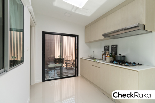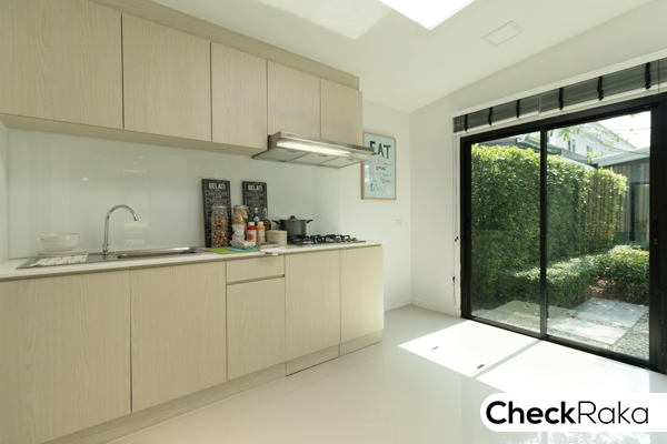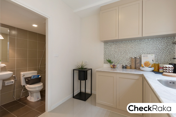 ซึ่งมีประตูทางเข้าตรงครัว ติดกับห้องน้ำ คือ ครัว และประตูด้านหลังเปิดออกไปลานซักล้างหลังบ้านได้ค่ะ
