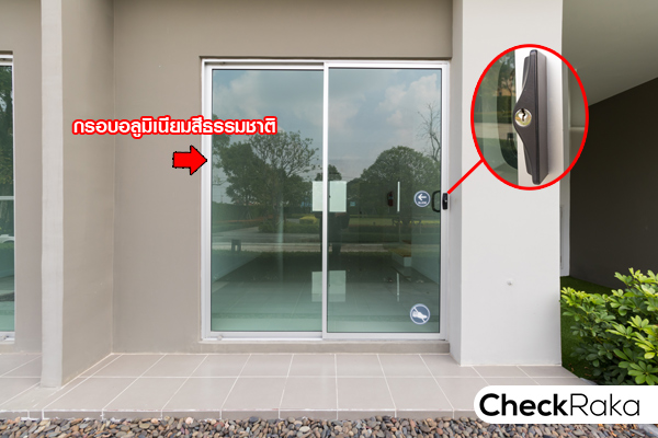 ประตูทางเข้าหลักเป็นประตูบานสไลด์เดี่ยว เปิดได้ด้านเดียว กรอบอลูมิเนียมสีธรรมชาติ กระจกเขียวตัดแสง