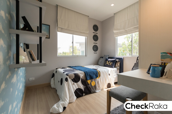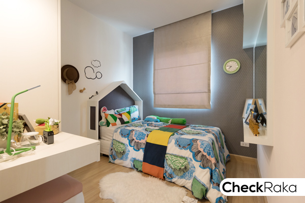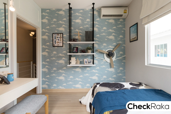 ห้องนอน 3 ขึ้นบันไดมาแล้วเจอเลยค่ะ เป็นห้องขนาดเล็ก ตกแต่งเป็นห้องนอนคุณลูก วางเตียง 3.5 ฟุต