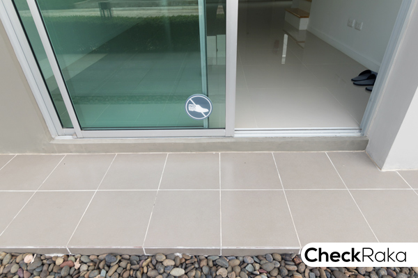 เฉลียงหน้าบ้านปูด้วยกระเบื้องเซรามิค สูงขึ้นมาจากพื้นที่จอดรถเล็กน้อย จะได้เดินเข้าได้สะดวก