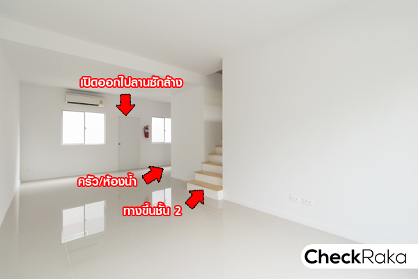 จากมุมนี้จะเห็นฟังก์ชั่นบ้านชั้น 1 ได้ชัดเจน เริ่มจากขวามือ คือบันไดทางขึ้นชั้น 2 จากนั้นเป็นห้องน้ำ