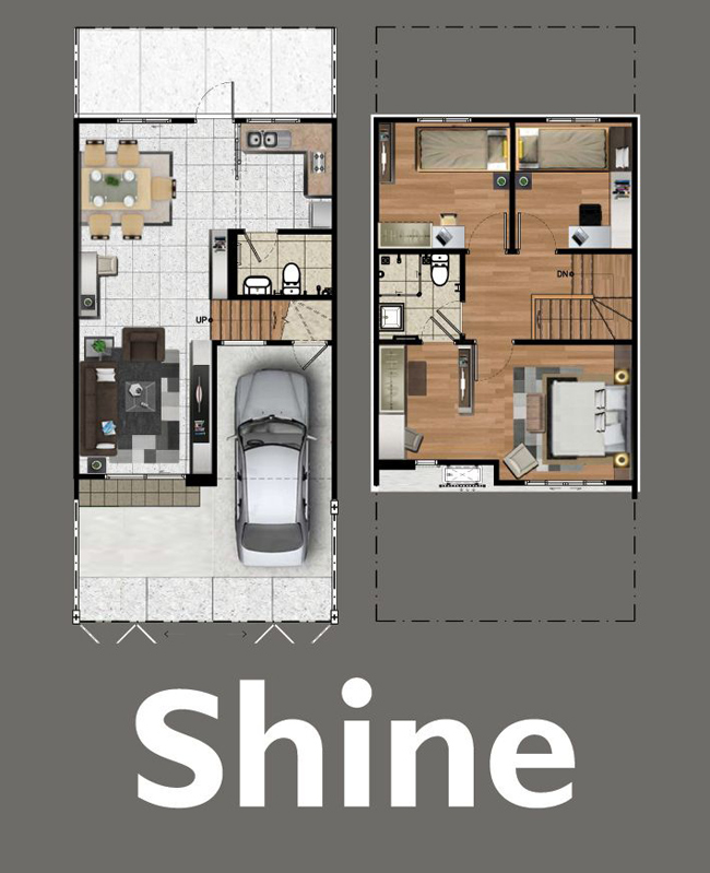 1. แบบบ้าน SHINE (ไชน์) - ทาวน์โฮม 2 ชั้น หน้ากว้าง 5.7 เมตร ที่ดินเริ่มต้น 19.8 ตร.ว. พื้นที่ใช้สอยประมาณ 110 ตร.ม. ขนาด 3 ห้องนอน 2 ห้องน้ำ ส่วนรับแขก เชื่อมต่อกับส่วนรับประทานอาหาร จอดรถได้ 1 คัน
