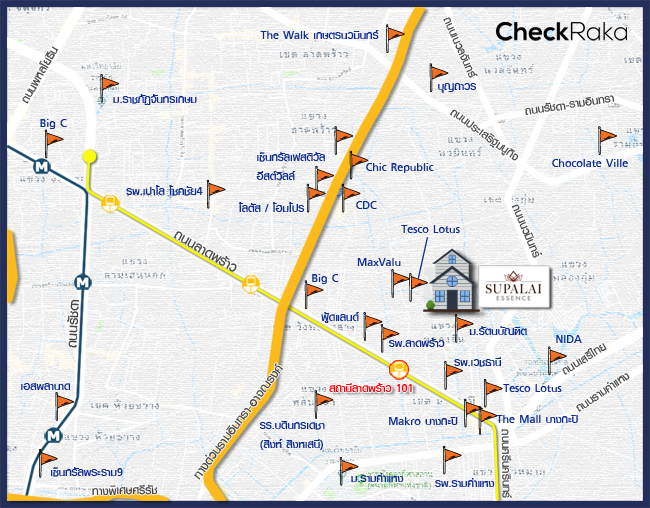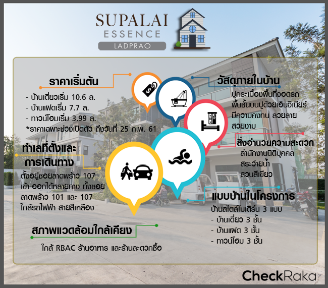 รีวิว-เยี่ยมชมบ้าน วันนี้ CheckRaka.com ขอพาทุกท่านไปเยี่ยมชม โครงการในทำเลใจกลางลาดพร้าวกันค่ะ ซึ่งโครงการนี้ เป็นบ้านจากแบรนด์ ศุภาลัย มีชื่อว่า ศุภาลัย เอสเซ้นส์ ลาดพร้าว (Supalai Essence Ladprao) โครงการนี้มีบ้านทั้งหมด 3 แบบ มีบ้านเดี่ยว 3 ชั้น, บ้านรุ่นใหม่ (บ้านแฝด) 3 ชั้น และทาวน์โฮม 3 ชั้น ซึ่งแบบบ้านทั้งหมดถือเป็นแบบบ้านรุ่นใหม่ฉีกกฏของศุภาลัยที่คุณไม่เคยเห็นที่ไหนมาก่อน กับบ้านสไตล์โมเดิร์น ประหยัดพลังงาน แต่ยังคงจัดเต็มเรื่องพื้นที่ใช้สอยที่ให้มาอย่างครบครัน ส่วนเรื่องทำเลนั้น โดดเด่นไม่แพ้กัน เพราะตั้งอยู่ในซอยลาดพร้าว 107 ใกล้ ม. RBAC ไม่ไกลจากรถไฟฟ้าสายสีเหลืองในอนาคต ซึ่งรถไฟฟ้าสายนี้จะช่วยอำนวยความสะดวกในการเดินทางให้ย่านนี้อย่างแน่นอน น่าสนใจใช่มั้ยคะ เดี๋ยวเรามาดูสรุปจุดเด่นของโครงการกันก่อนค่ะ
