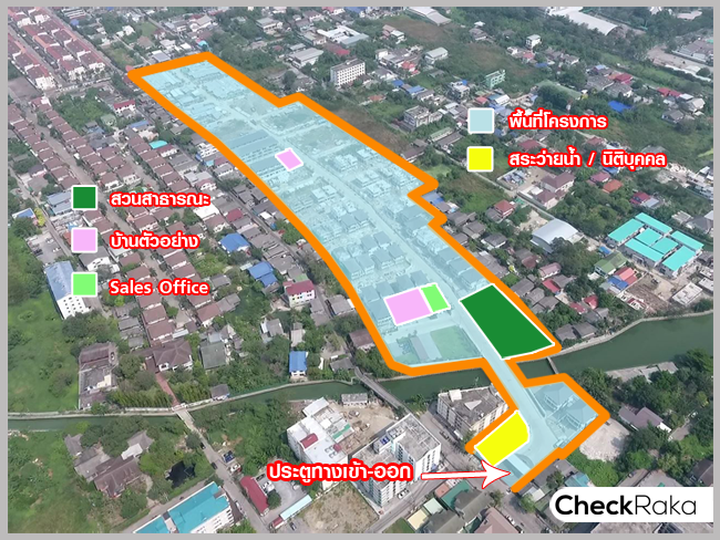 แสดงให้เห็นถึงขอบเขตโครงการโดยรวม สวนสาธารณะ สระว่ายน้ำ สำนักงานขาย บ้านตัวอย่าง และทางเข้า-ออก