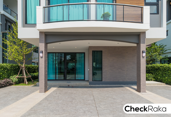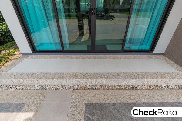 พื้นทางเข้าหน้าบ้านเป็นทรายล้าง กับกระเบื้อง ยกสเต็ปตรงหน้าประตูให้ 1 ขั้น สูงจากพื้นโรงจอดรถเล็กน้อย