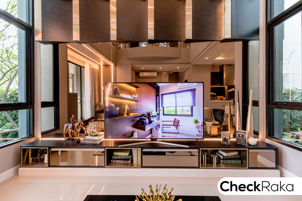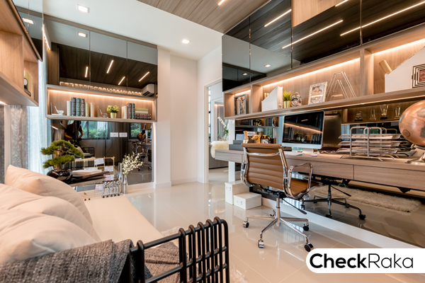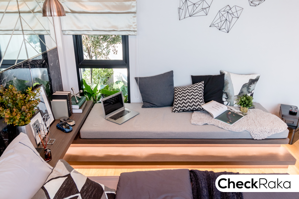 จัดมุมตรงนี้เป็นมุมทำงาน อ่านหนังสือ หรือนั่งเล่นพักผ่อน ให้ความรู้สึกเหมือนอยู่คอนโด