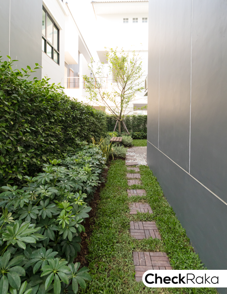 ส่วนรูปแบบการจัดสวน อาจจะแตกต่างกันไปแล้วแต่หลัง รั้วระหว่างบ้านสูงประมาณ 1.5 เมตร