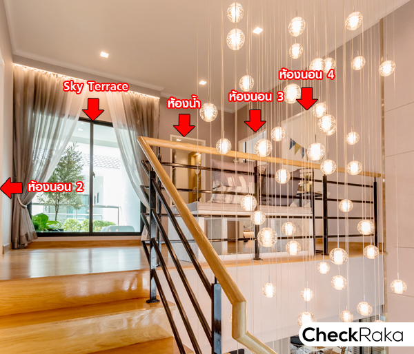 ฟังก์ชั่นชั้น 3 เริ่มจากซ้ายมือ คือห้องนอน 2 จากนั้นเป็น Sky Terrace ถัดมาคือ ห้องน้ำ และ ห้องนอน 3
