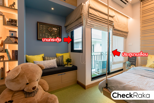 โต๊ะอ่านหนังสือ ทำการบ้านก็ได้ ด้านข้างมีหน้าต่างบานกระทุ้ง 1 บาน และถัดกันมีประตูบานเลื่อน เปิดออกไป